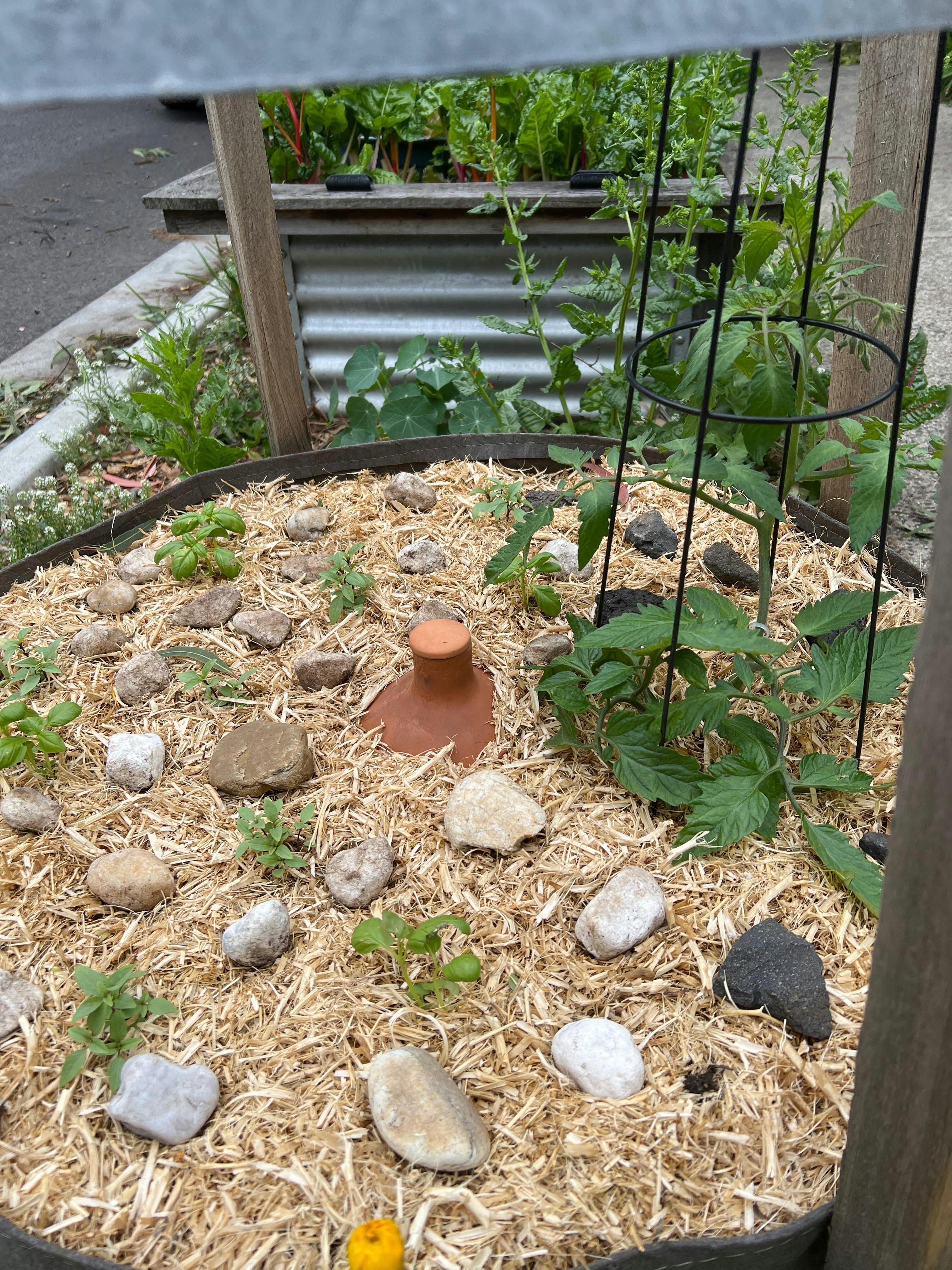 Apply a thick layer of mulch of your choice eg Sugar cane mulch or bark and DON’T FORGET to check the water level and try not to let it fall below half way to prevent mineral build up